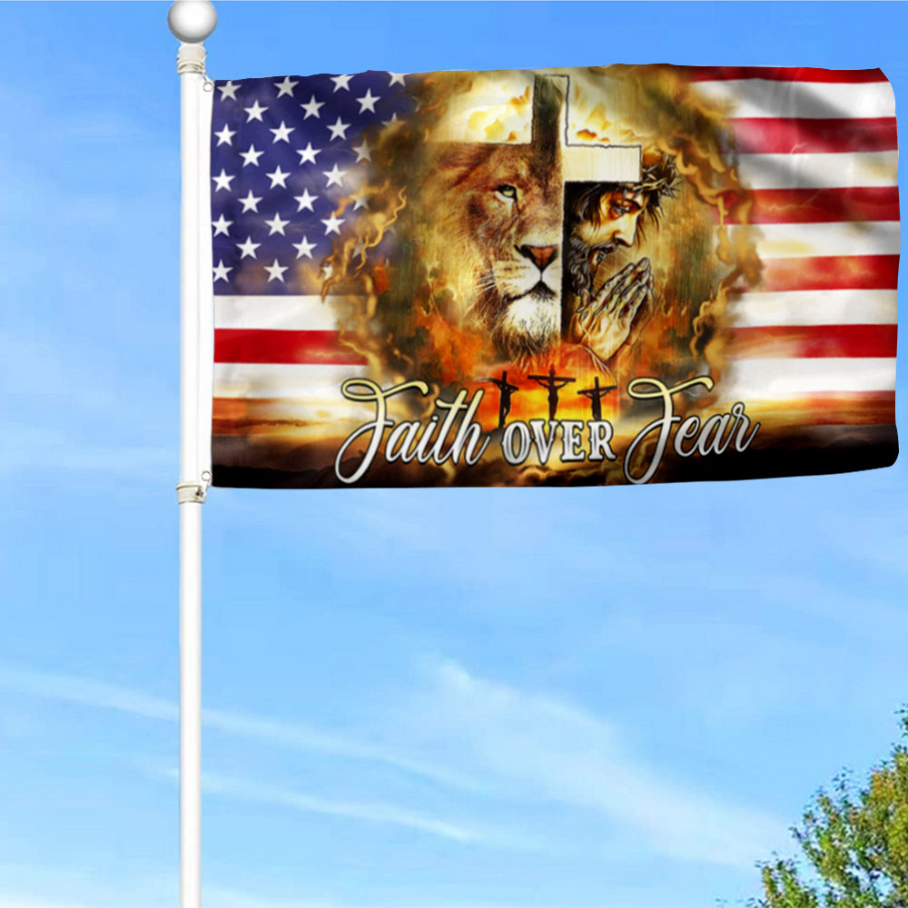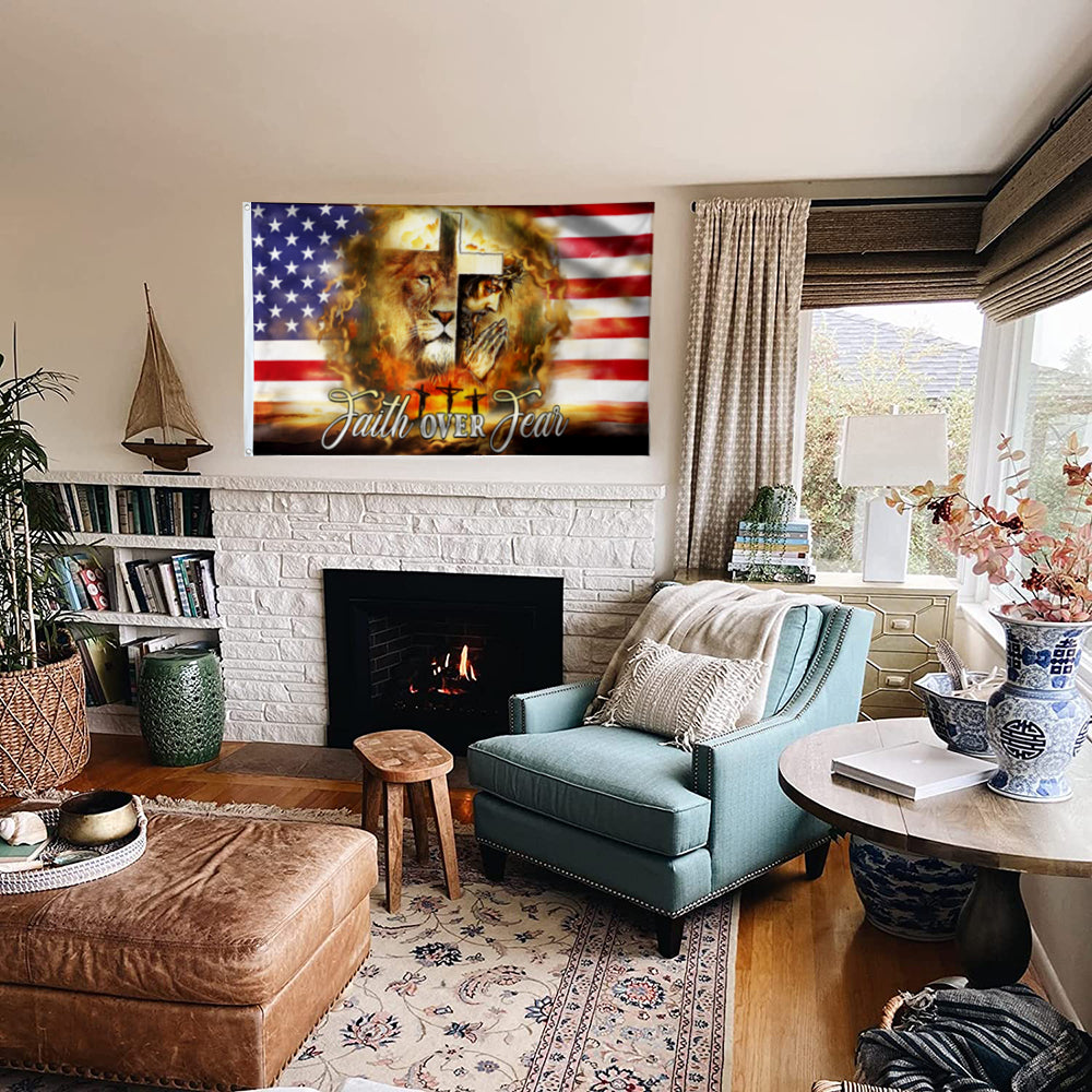 Fyon Jesus And Lion. Faith Over Fear. Christian Cross American Flag 41024 Indoor and outdoor banner